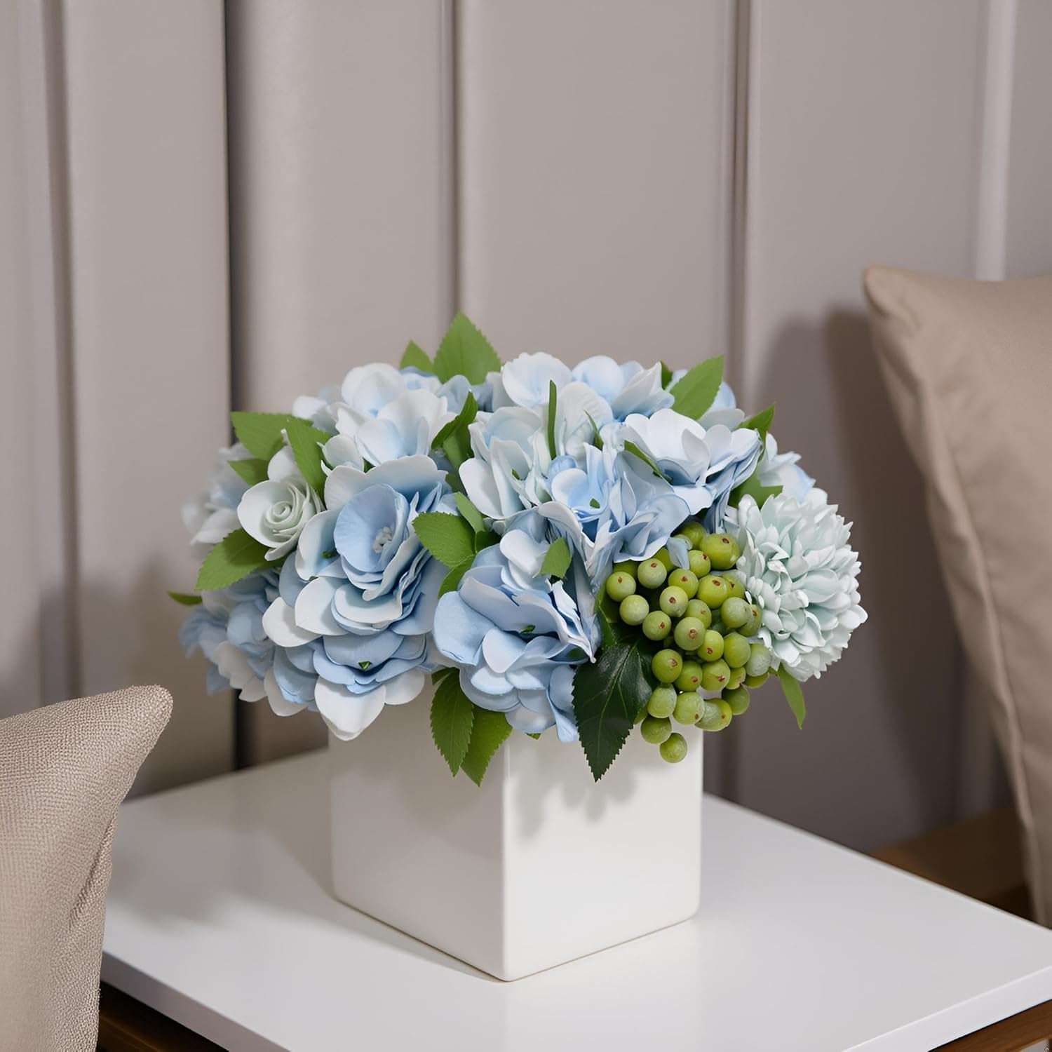 - ELEGANT DESIGN: Stunning artificial hydrangea arrangement featuring light blue blooms and green berries in a sleek white ceramic vase, perfect for modern home decor