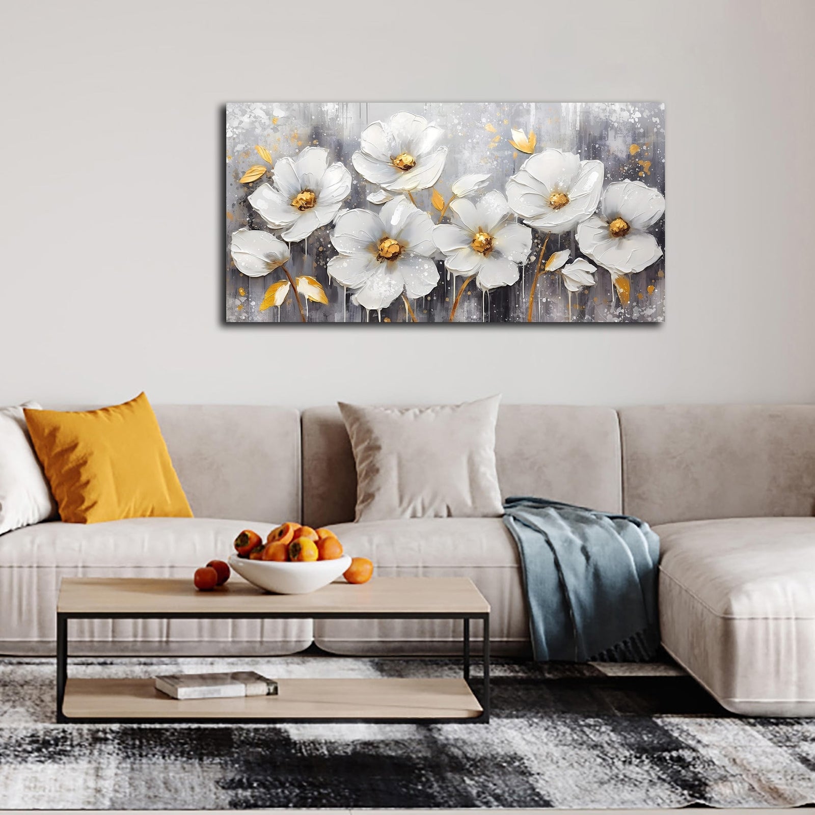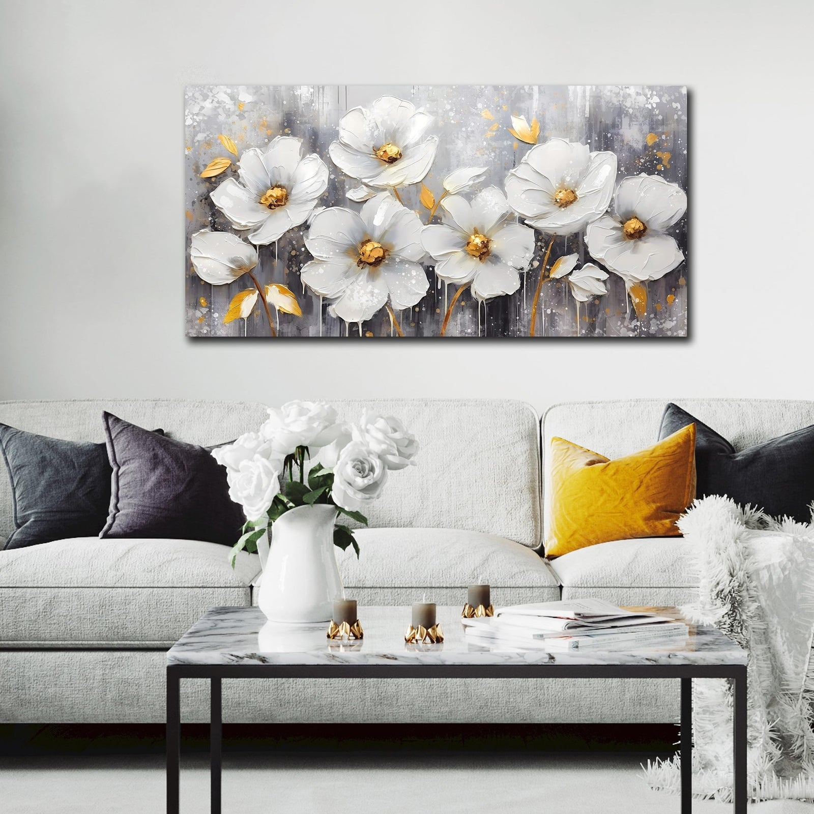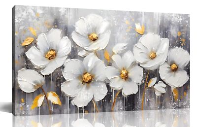 - STYLISH CANVAS ART DESIGN Looks exactly as pictured,Good idea for home interior walls decor such as guest room, office decor, hotel, dining room wall decor and others. Its a great gift ideal to your friends.Flower wall art white wall decor gold wall art