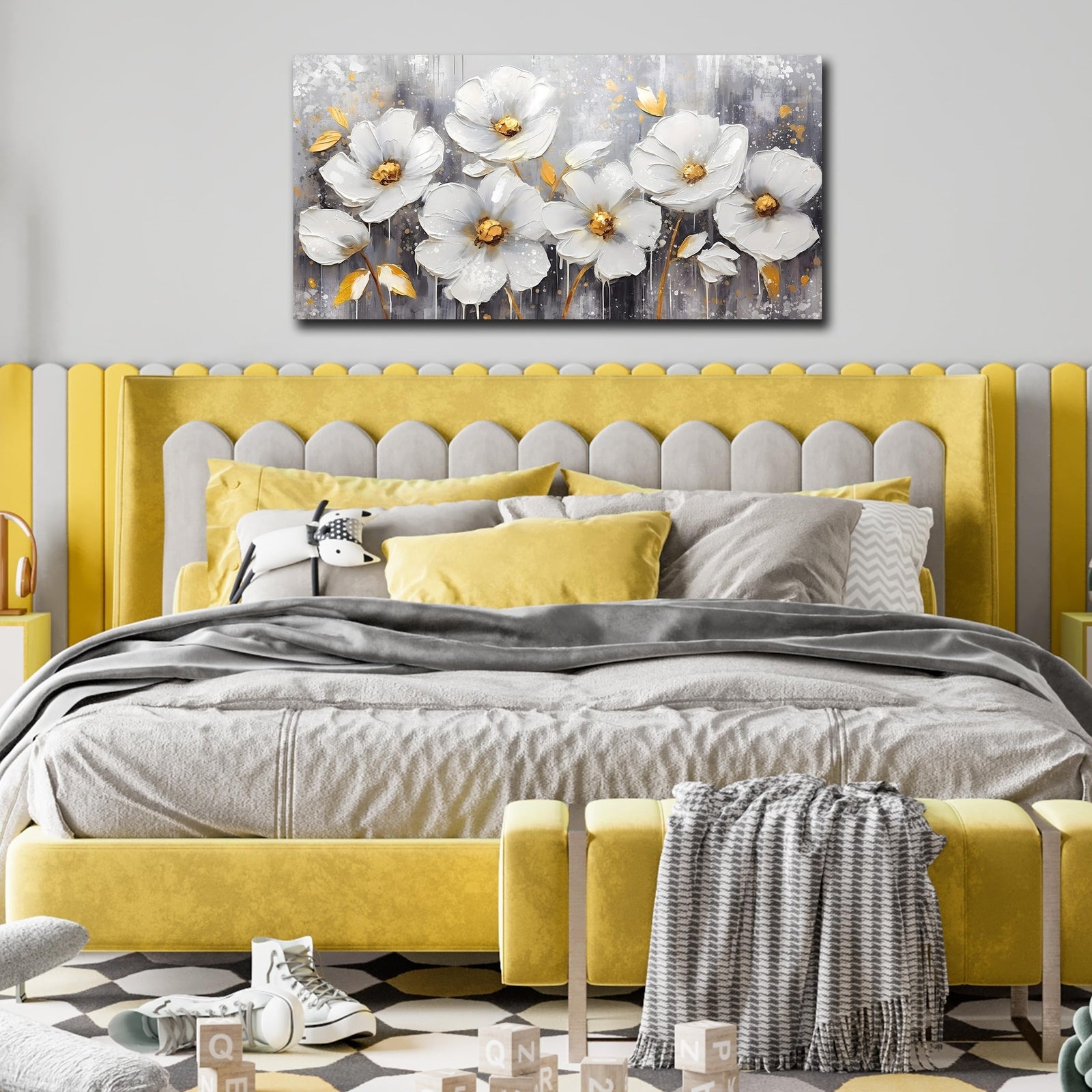 - EASY TO HANG Each panel of canvas prints already stretched on solid wooden frames, gallery wrapped, lightweight,ready to hang. The side margins are also printed to create a particularly decorative effect.Flower wall art white wall decor gold wall art.Added color and fun to your bedroom, living room,office, dormitory or apartment.