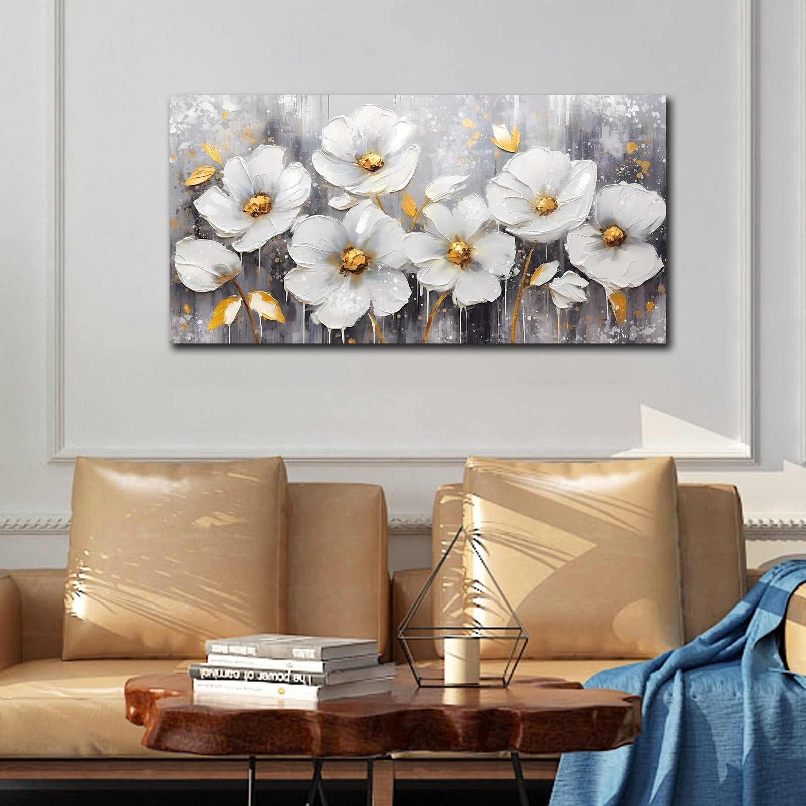 - CANVAS WALL ART SIZE Size is 20" x 40"Flower wall art white wall decor gold wall art