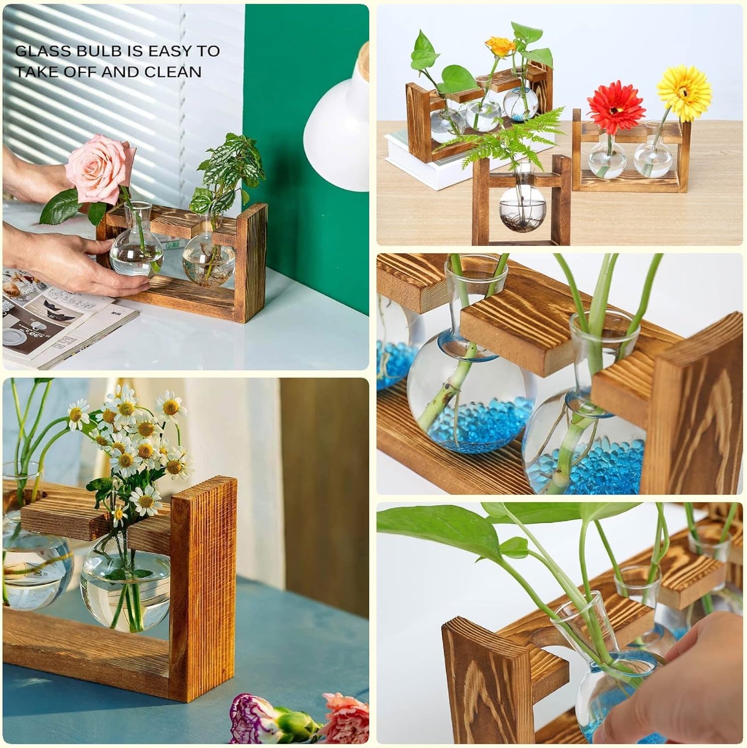 - Stylish Propagation Station & Desktop Decor:Elevate indoor gardening with this 3-bulb glass terrarium on retro wood stand. Functions as plant propagation station and hydroponic planter. Transparent borosilicate vases beautifully display cuttings, herbs, and pothos. Perfect for kitchens, offices, and wedding centerpieces.