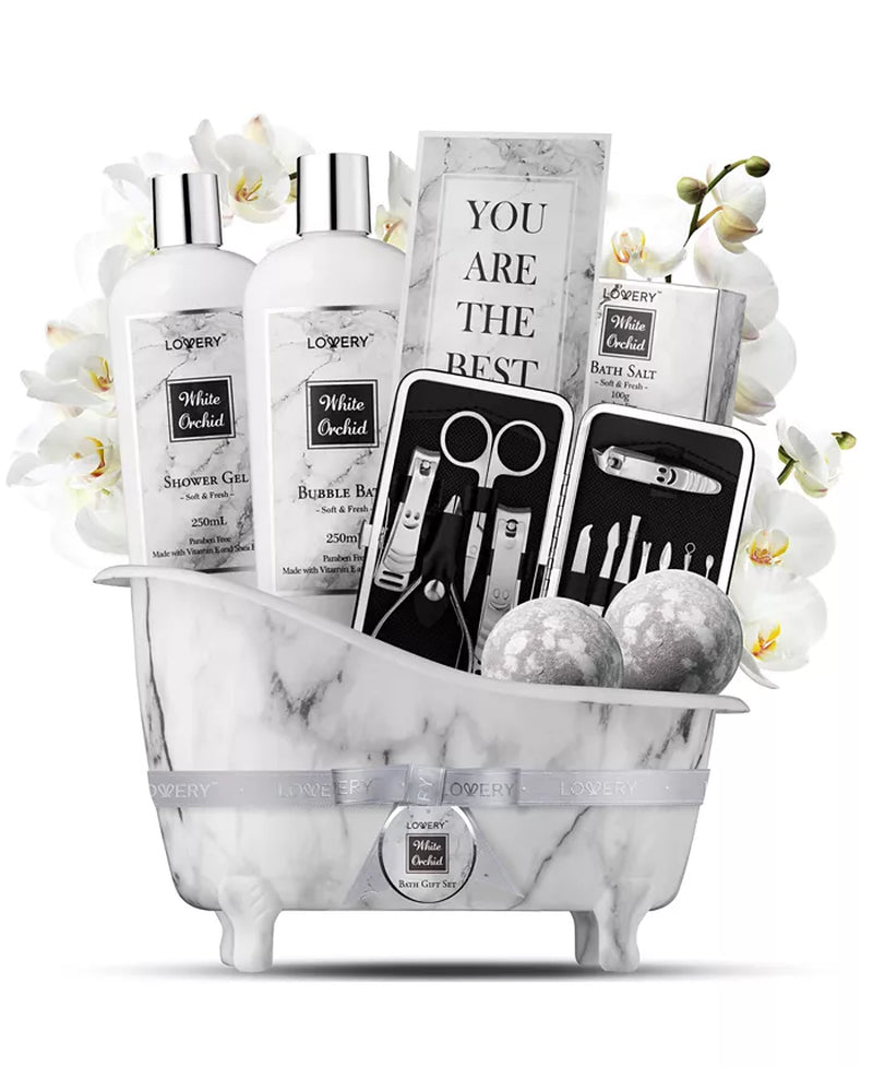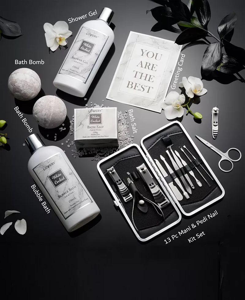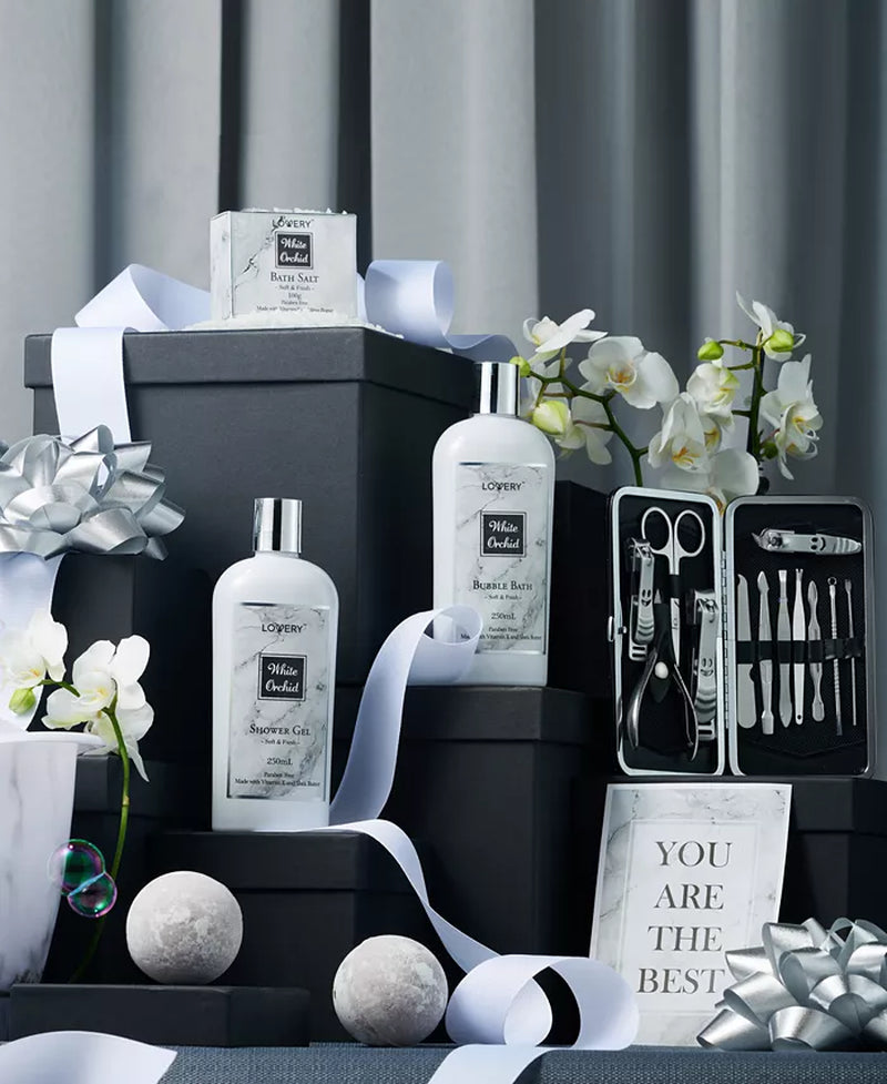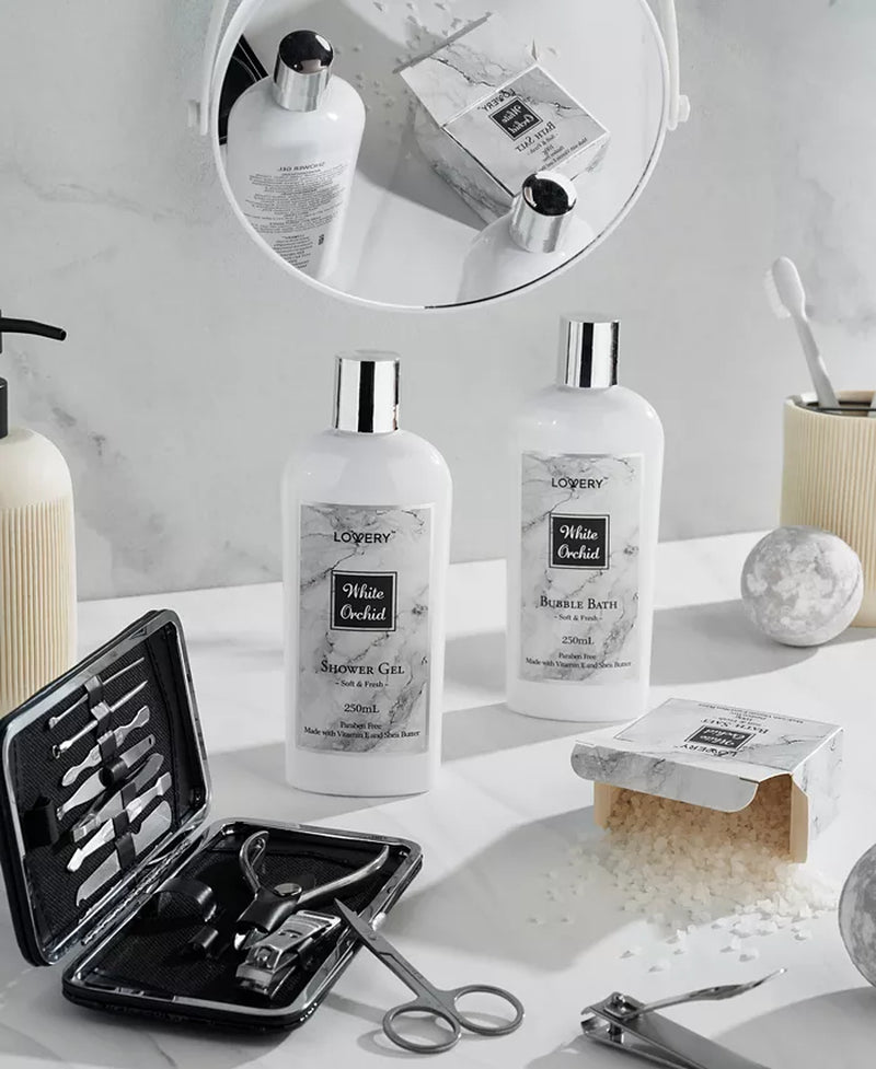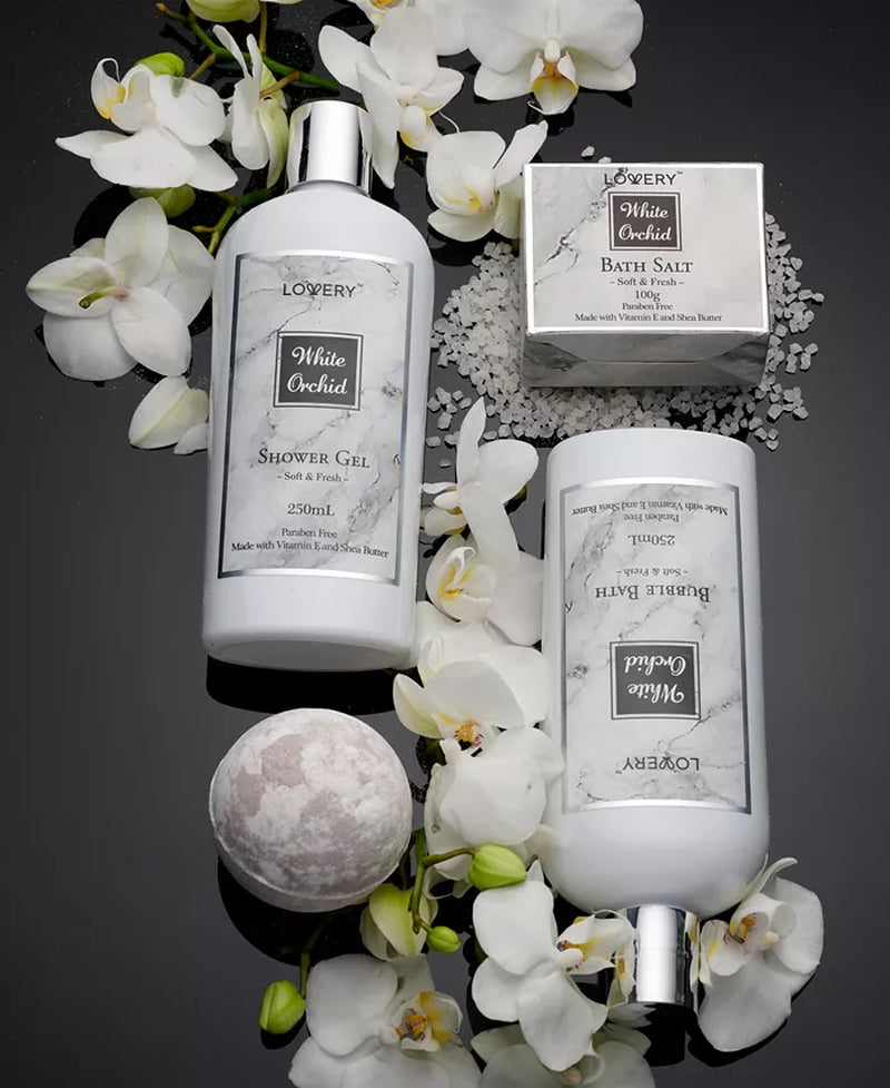 These bath and body essentials is wrapped in a beautiful marbleized tub. Reclaim a sense of tranquillity and a magical feeling of serenity with Lovery white orchid bath set.