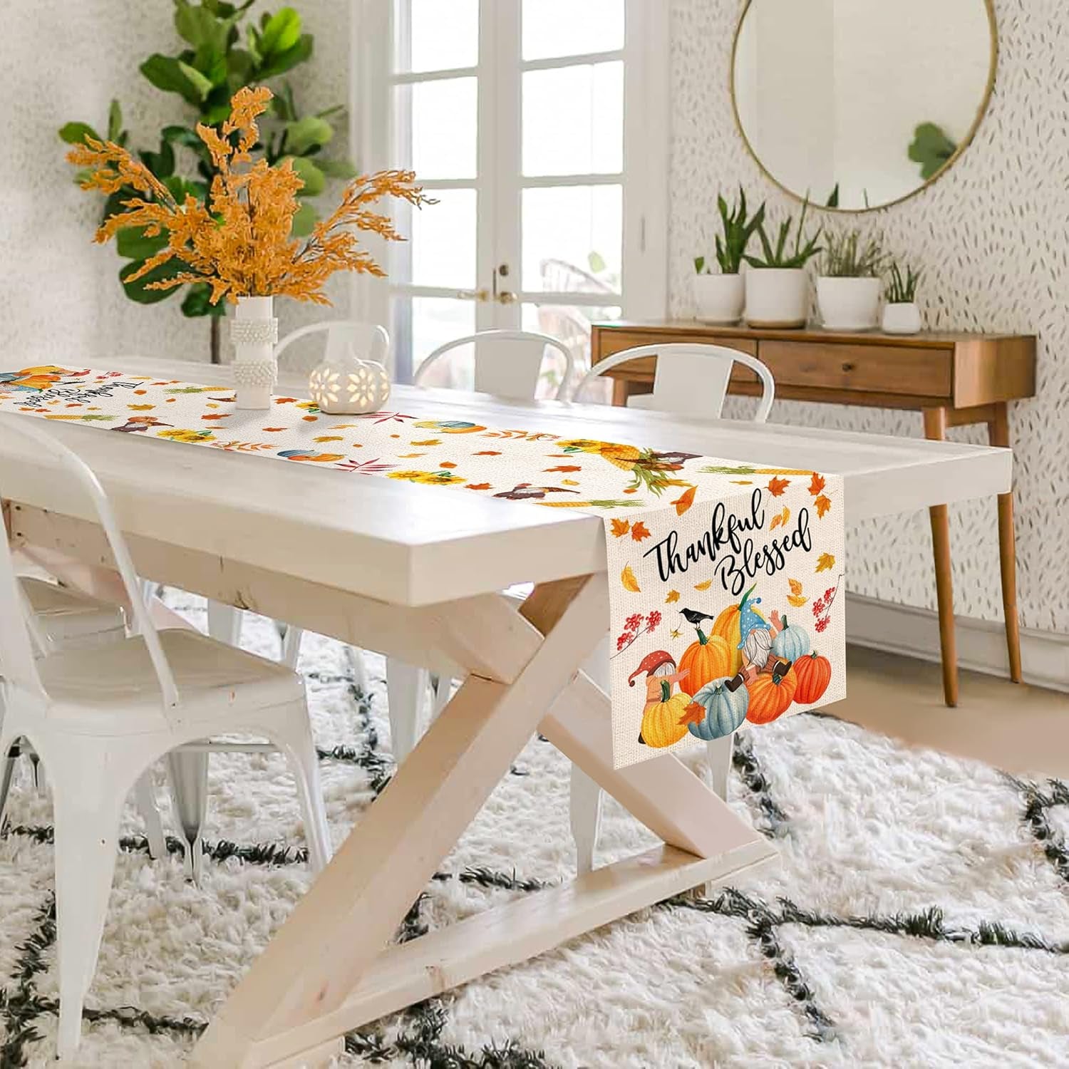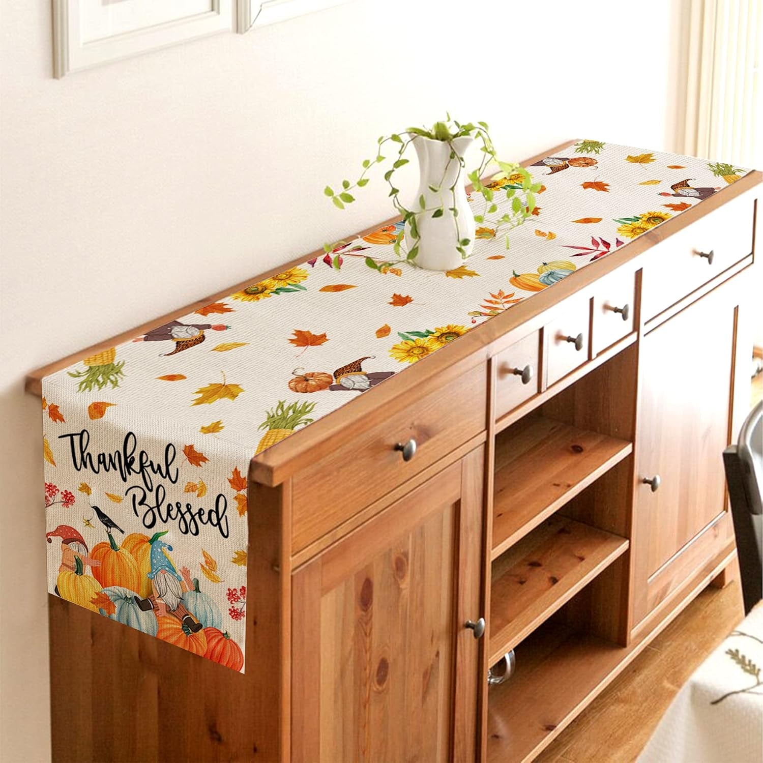 - 【 Thankful Grateful Quotes Clearly Printed on Decorative Thanksgiving Table Runner 】 Vibrant orange blue colors and cutest pumpkins, gnomes are all clearly printed on our fall tablecloth, with cute pattern, cute and vivid. Keep this fall runner for table for long time, colors would not fade, and keep as new as ever.
