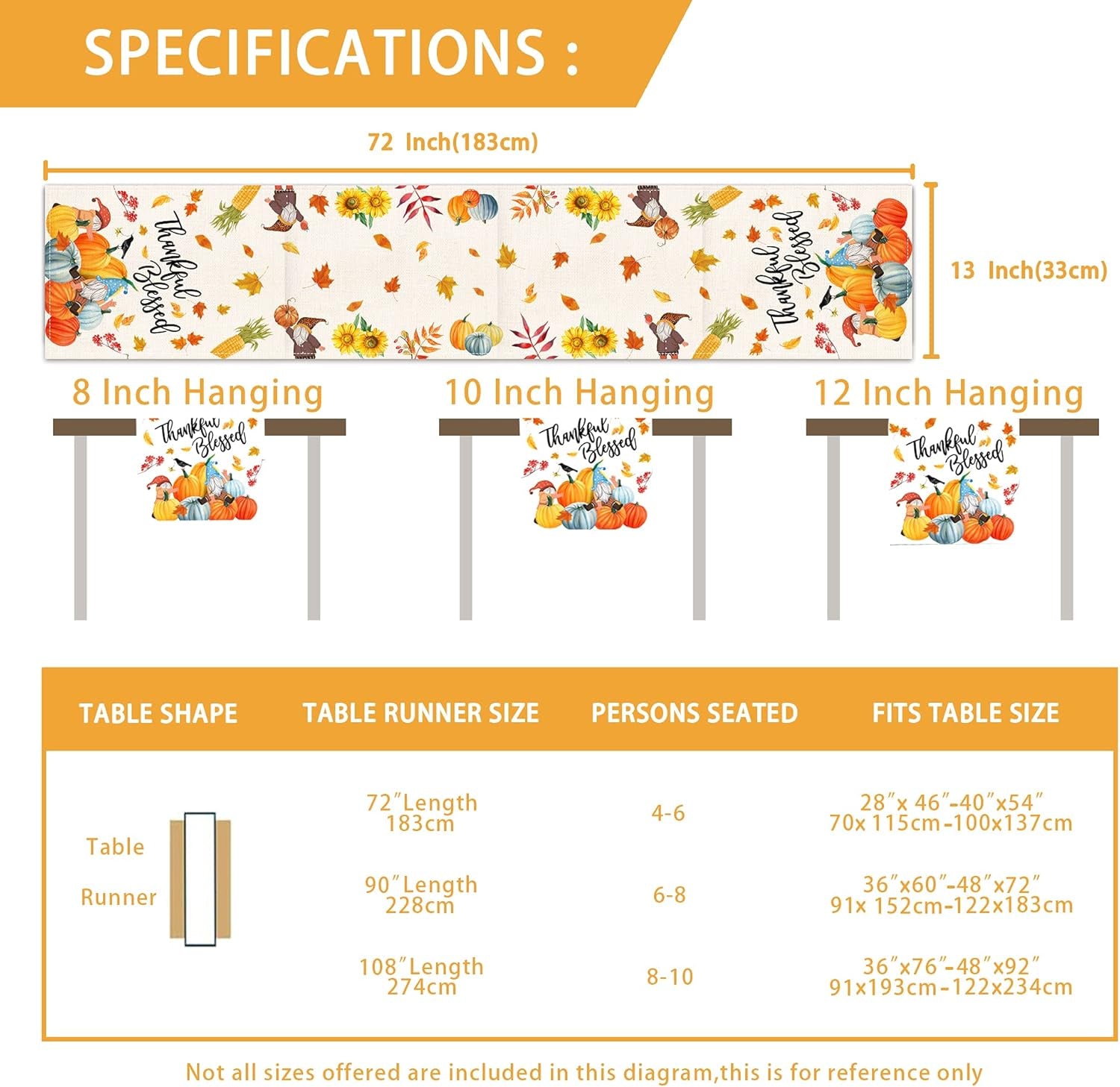 - 【 Durable Thanksgiving Table Runner 】 Made of durable burlap linen fabric, comfortable and thick, neat and easy to be flatten. Measuring 13" wide x 72" long ( 33cm x 183cm ), this fall gnome runners 72 inches long appropiately fit for rectangle dinning table that seat 4-6 people, coffee table decorations etc. Brighten the dining table by this farmhouse runners and takes you a delightful dining experience.